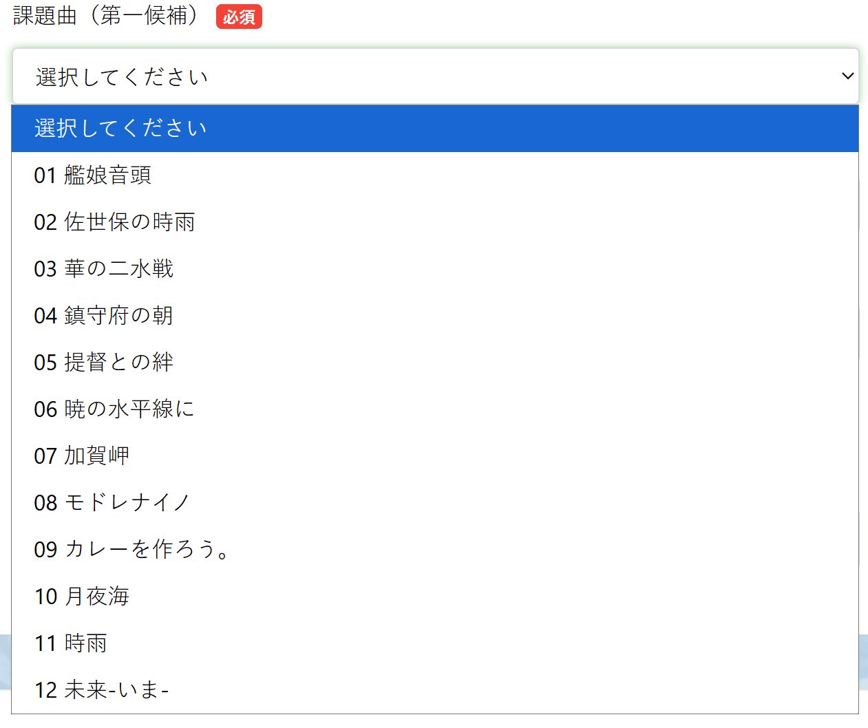 課題曲はゲーム内の歌詞付きの楽曲やZZ級クソアニメのOPEDなどのいわゆる【艦王ソング】が対象。中には配信のみで音源が存在しない電子ドラッグ【カレーも作ろう】も含まれている。エントリー後に音源が届くが、原曲とは微妙にテンポが異なるらしい。簡単に歌われたら悔しいじゃないですか微差栗