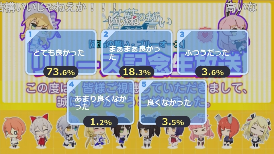 生放送自体はYouTube側の配信が原因不明の「規約違反」により一時的にBANされるアクシデントもあったが時間内に回復し、草生では6万人を集めて[[「1:とても良かった」が73.6%>https://pbs.twimg.com/media/EVUtyggUEAYMSkS.jpg]]とアビホラの時のような艦太郎の突撃も不発のまま無事に終了した。