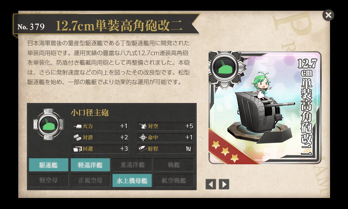 火力も高く(日駆逐モチーフと思しきキャラのくせに全形態雷装よりも高い)、ボス到達編成の関係上全員ワンパンされる(丁ならフル改造重巡が乱数で1発耐える)。